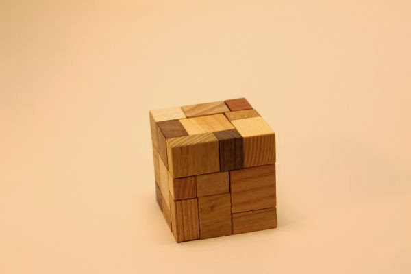 Pero Vinco ha dispuesto estos trozos de una forma bastante menos evidente, de forma que ningún plano de corte se puede apreciar en el cubo una vez puestas las piezas en su sitio. En caso contrario el puzzle se podría separar en dos partes sin huecos ni salientes, y el juego perdería mucho atractivo. Además es ingenioso el hecho de que cada pieza esté formada exactamente por tres trozos de madera. Y que estos trozos queden dispuestos para que cada pieza tenga una altura constante.